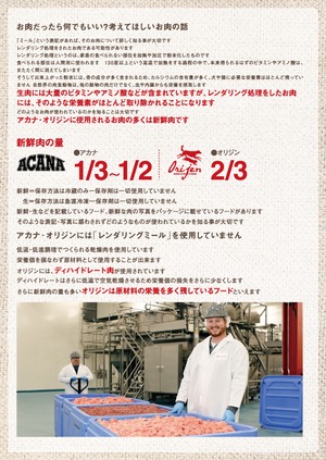 1当社で放し飼いしている鶏や七面鳥は、屋外には出られませんが、ケージに入れられておらず、納屋の中で自由に動き回ることができます。 2使用している新鮮な原材料は、保存法として冷蔵保存のみを採用しており、生の原材料は最高の鮮度で冷凍されています。 3この数値は近似値であり、未加工の原材料から導き出されています。